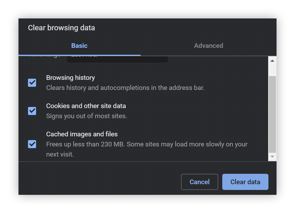 Make sure that all the necessary cache data is checked: Browsing history, Cookies and other site data, and Cached images and files. Then click Clear data.